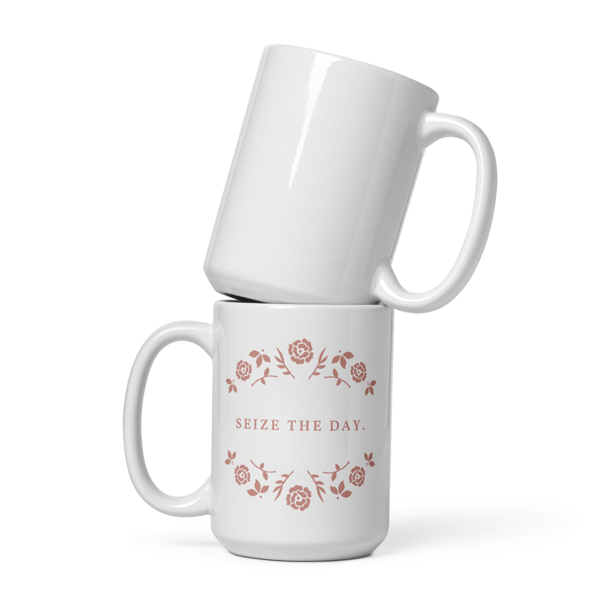 Start your day with a boost of motivation with our "Seize the Day" inspirational mug! This uplifting design features the phrase "Seize the Day" in a dynamic, eye-catching font, reminding you to embrace every moment with enthusiasm and purpose. Whether you're drinking your morning coffee, evening tea, or something in between—this mug's for you! It's sturdy and glossy with a vivid print that'll withstand the microwave and dishwasher.
